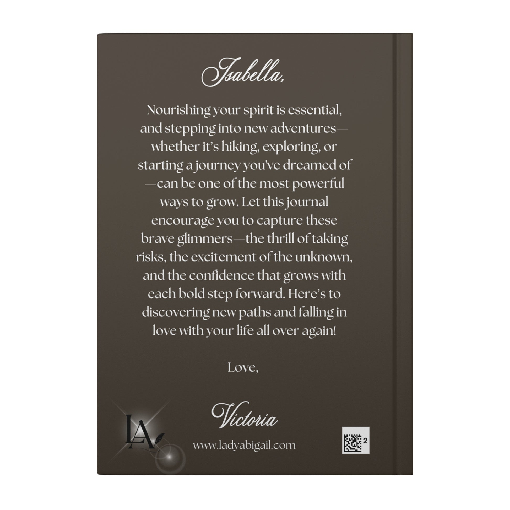 This journal is uniquely yours, with options to personalize the spine (up to 25 characters for a name, date, or meaningful phrase) and the back cover (up to 100 words) with a message for yourself or a loved one. Our journal make a very thoughtful gift. **ADD YOUR PERSONALIZATION TO THE "ORDER SPECIAL INSTRUCTIONS" FIELD DURING CHECKOUT**